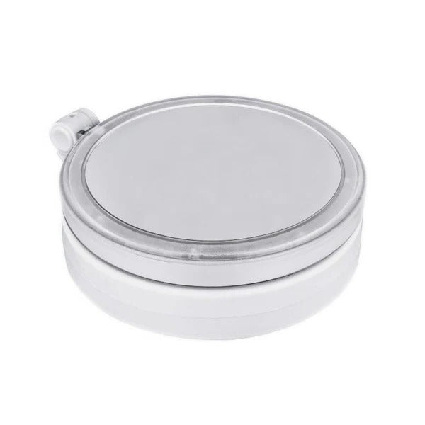 This folding vanity mirror features integrated LED lighting to support clear visibility for grooming or makeup application in low-light conditions. Its compact form makes it suitable for both home and travel use.