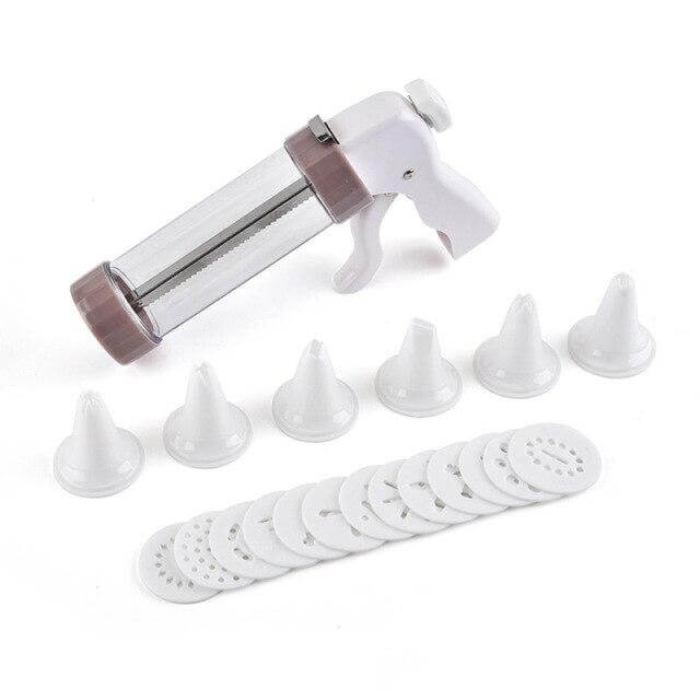 Cookie press gun set with ABS plastic easy-grip trigger handle.